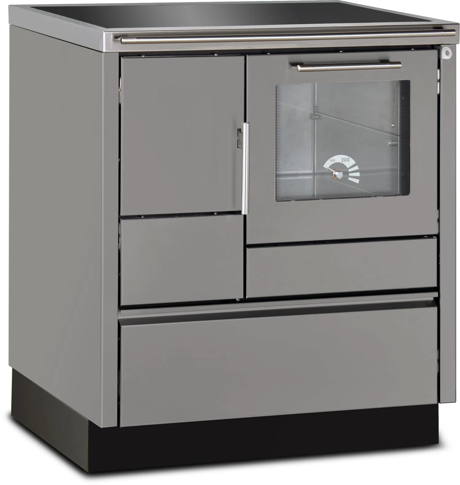 Schließlich wartet der Herd mit hitzeisolierten Edelstahlgriffen, einer Herdstange und einer großen Holzlade im Sockelbereich auf.