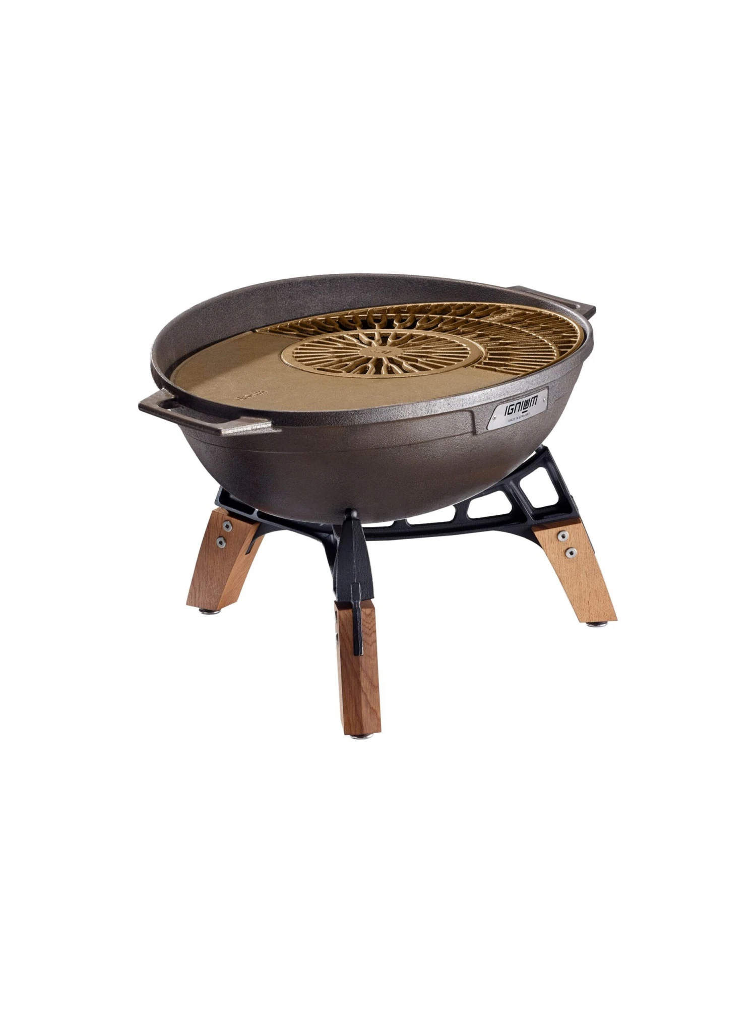 Die Verwendung von hochwertigem, recyceltem Gusseisen als Material für die Feuerschale ist ein weiterer Vorteil, da es eine ausgezeichnete Wärmeleitung und -speicherung ermöglicht. Des Weiteren sind die Füße aus regionalem Eichenholz gefertigt.
