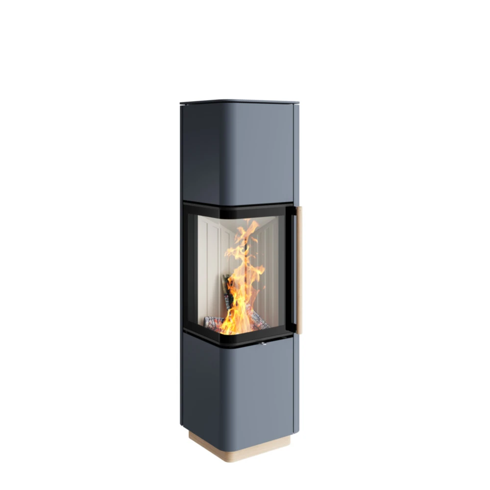 Die markante Eckform mit abgerundeten Kanten und die modernen Holzdetails an Griff und Sockel verleihen diesem Schwedenofen eine einzigartige Ausstrahlung. Die großzügige Ecksichtscheibe ermöglicht einen unverstellten Blick auf das faszinierende Flammenspiel.